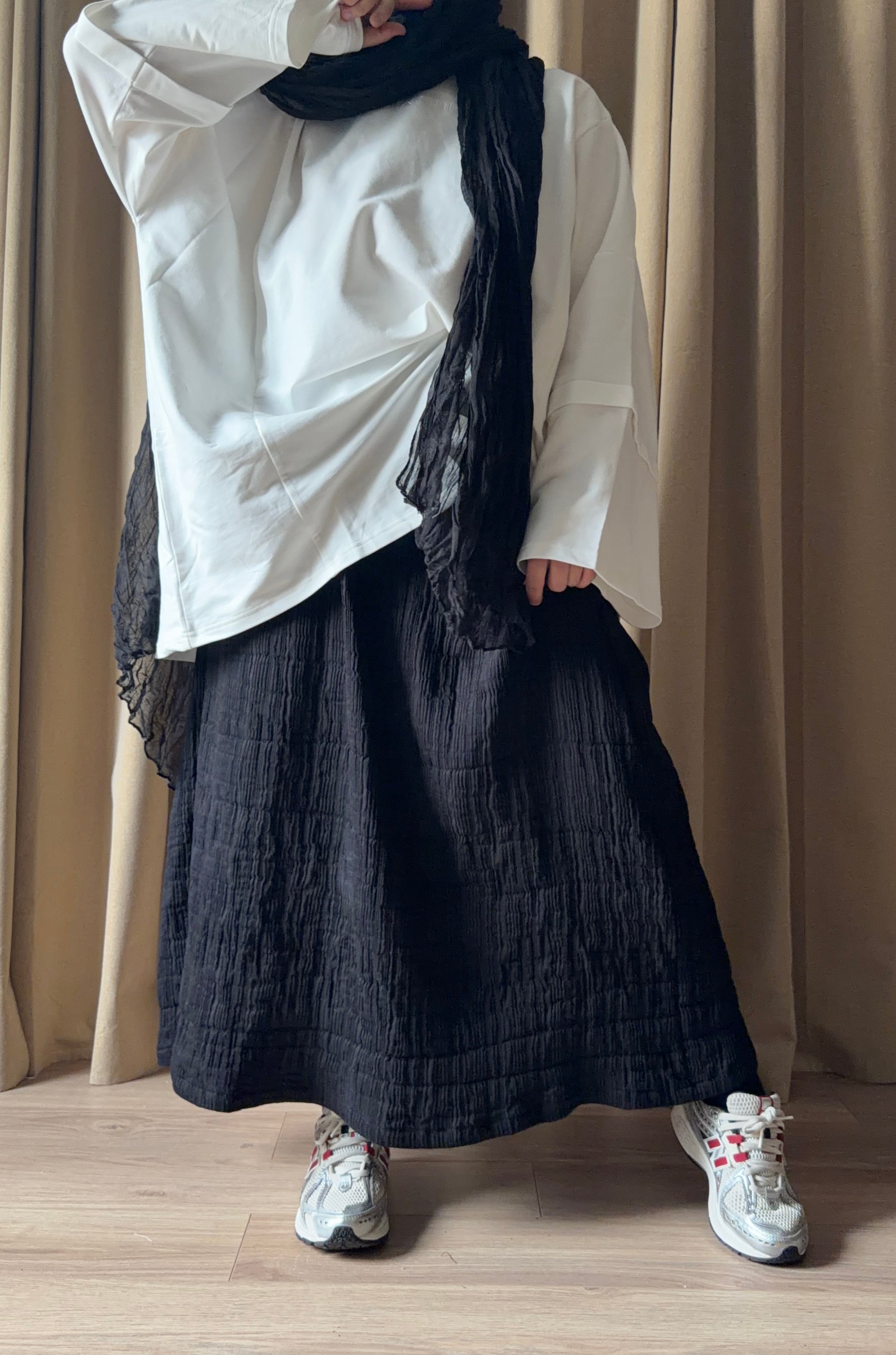 Avec ses dimensions généreuses (90 × 300 cm), il offre une couvrance parfaite tout en conservant un tombé fluide et aérien. Sa texture légèrement texturée apporte une tenue naturelle, facile à travailler sans alourdir la silhouette.