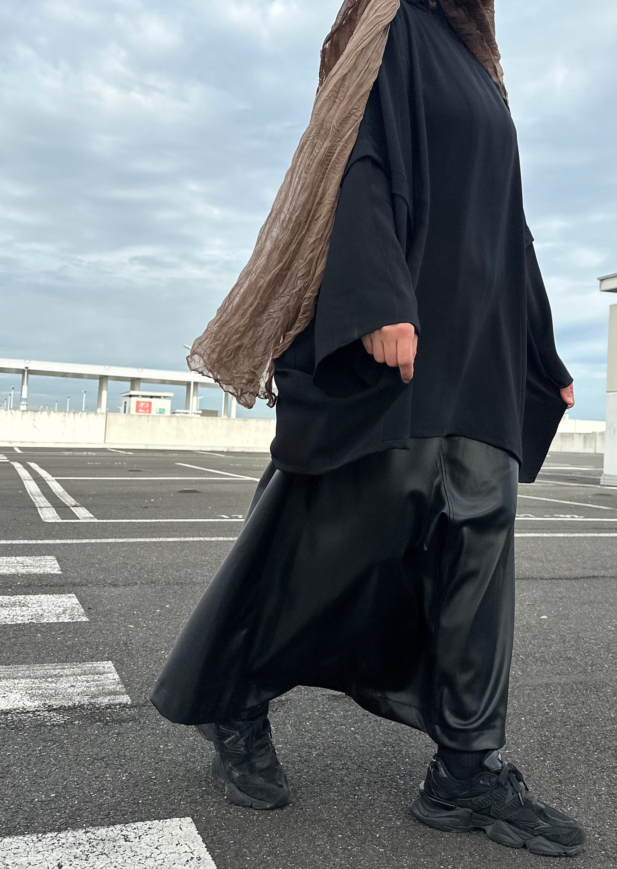 Une jupe qui coche toutes les valises. Confectionnée dans un cuir 100 % vegan, sans PVC , elle offre un toucher souple , un tissu chaud et couvrant , et une vraie résistance aux intempéries . Sa coupe ample et confortable accompagne les mouvements sans contraindre, pour un rendu structuré et vivant.